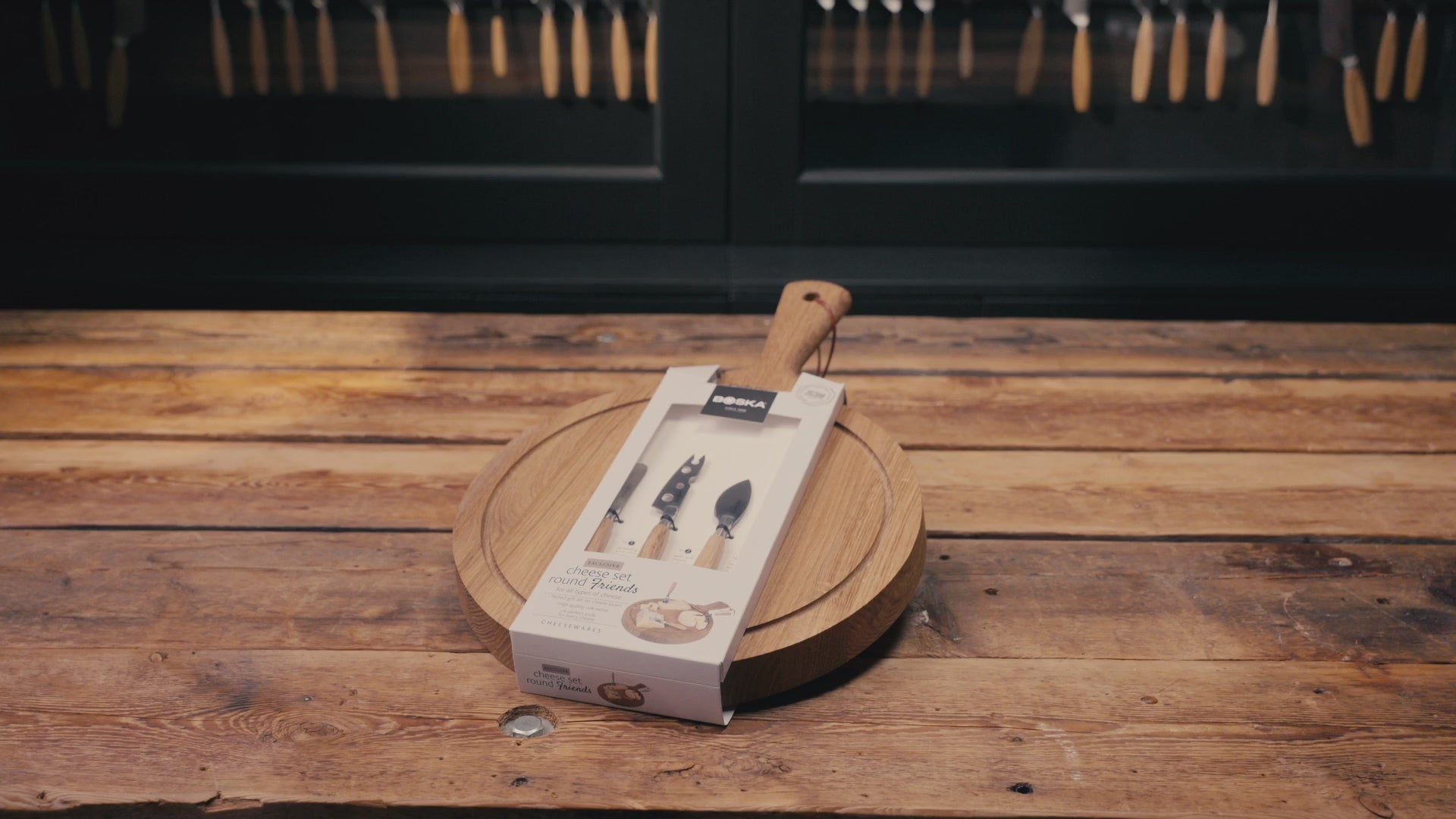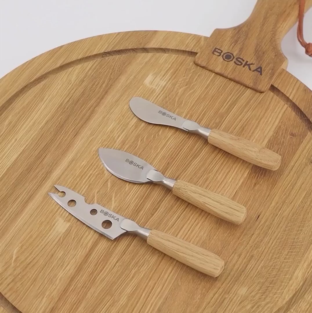 Friends ostasettið inniheldur tæplega 30cm hringlaga bretti úr eikarvið ásamt 3 ryðfríum ostahnífum sem henta stífari og mýkri ostum. Settið er tilvalinn gjafapakki.