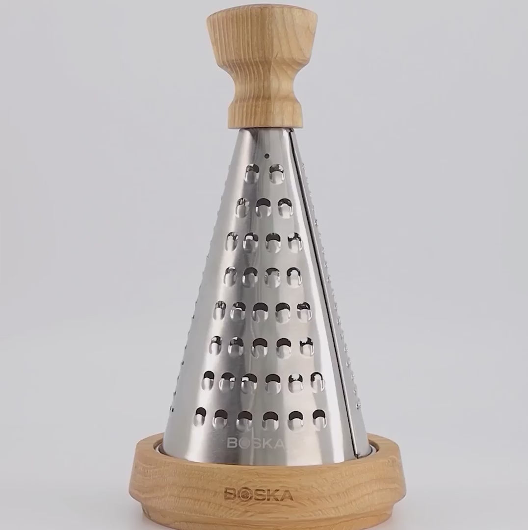 Þægilegt ostarifjárn með þremur mismunandi grófleikum. Undir járninu er færanlegur eikar diskur sem safnar ostinum.